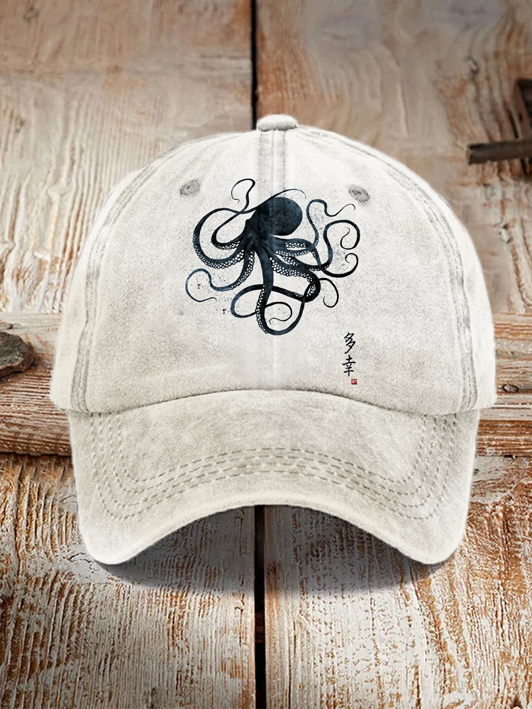 Pluslx Octopus Japanese Calligraphy Art Washed Cap