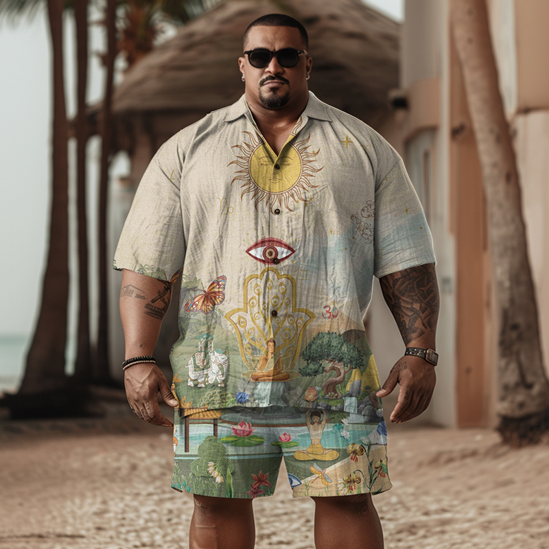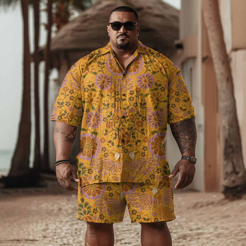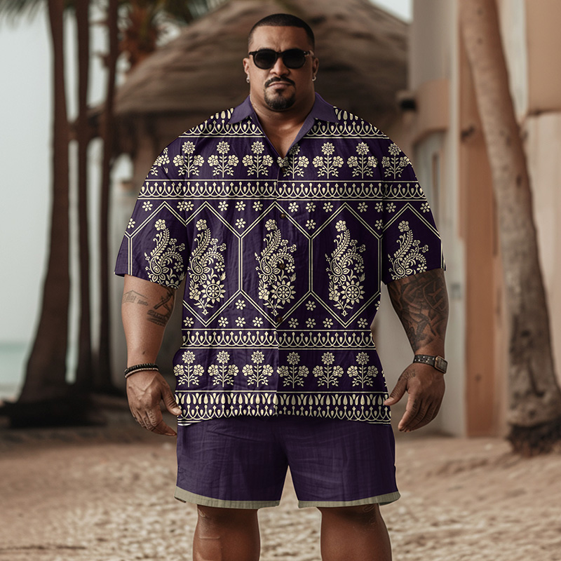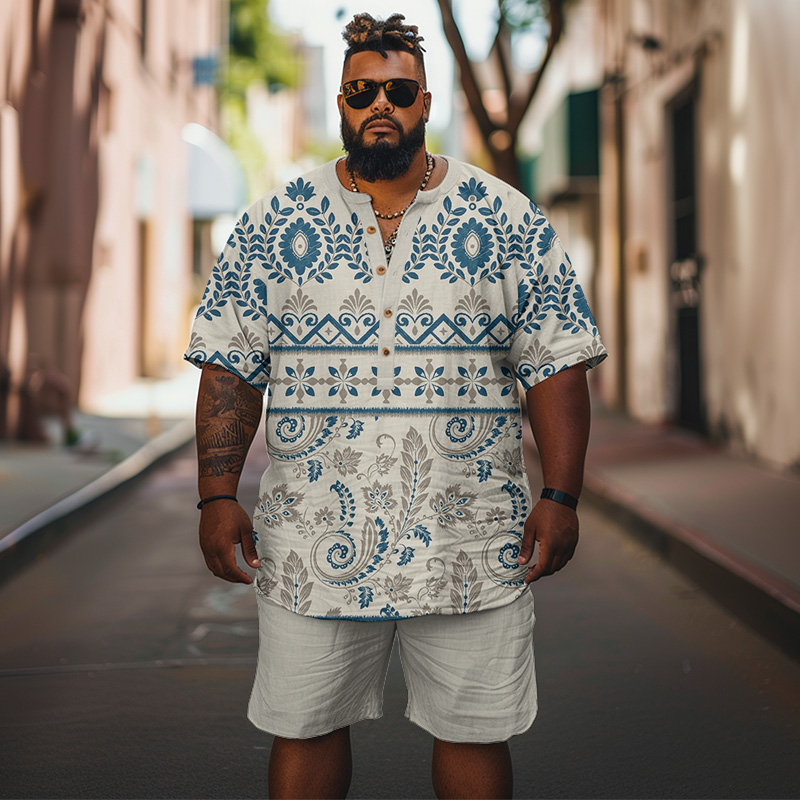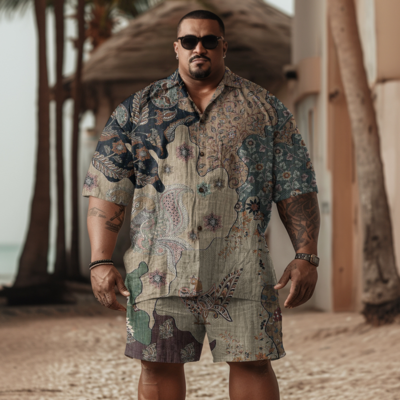 L-9XL Vintage Pattern Henry Collar Vacation Style Short Sleeved Shorts Two-piece Set