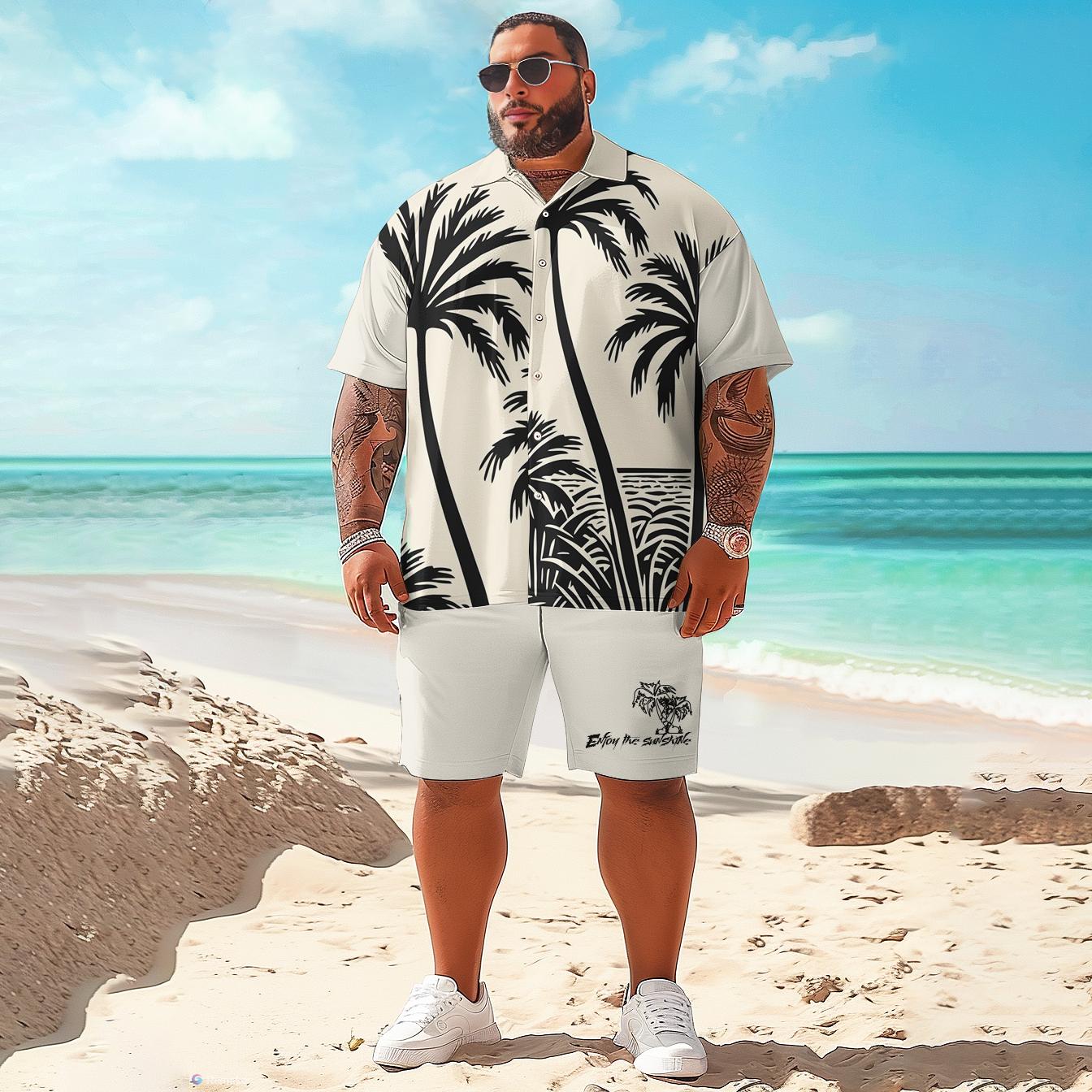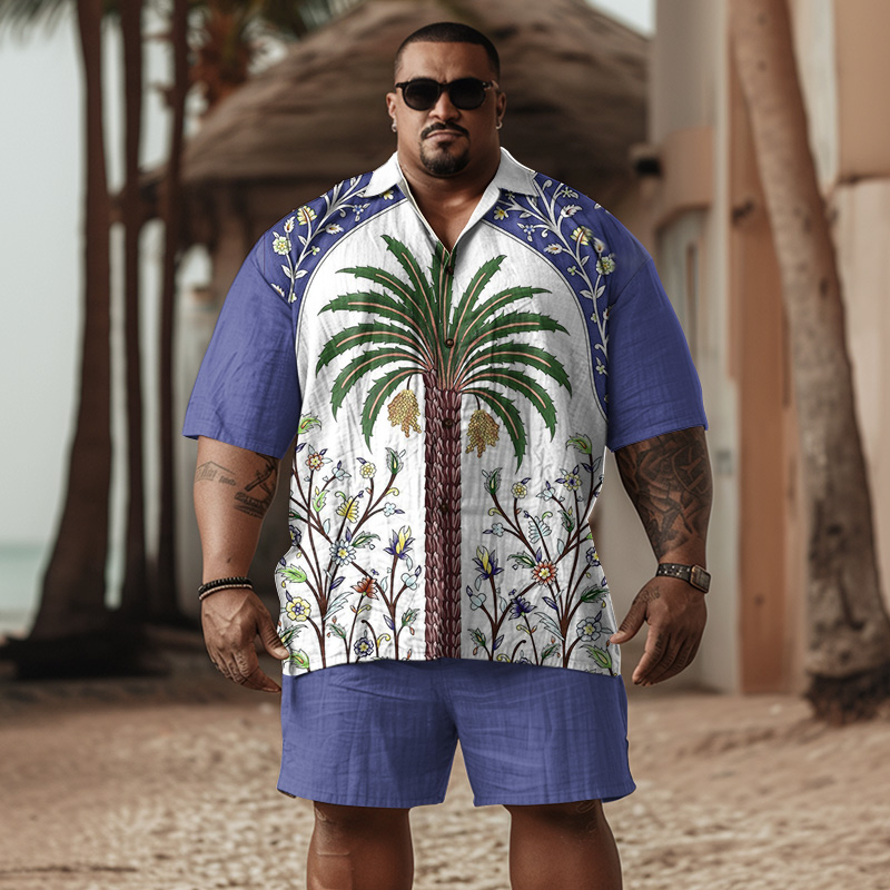 L-9XL Coconut Tree And Grass Pattern Antique Vacation Style Short Sleeved Shorts Two-piece Set