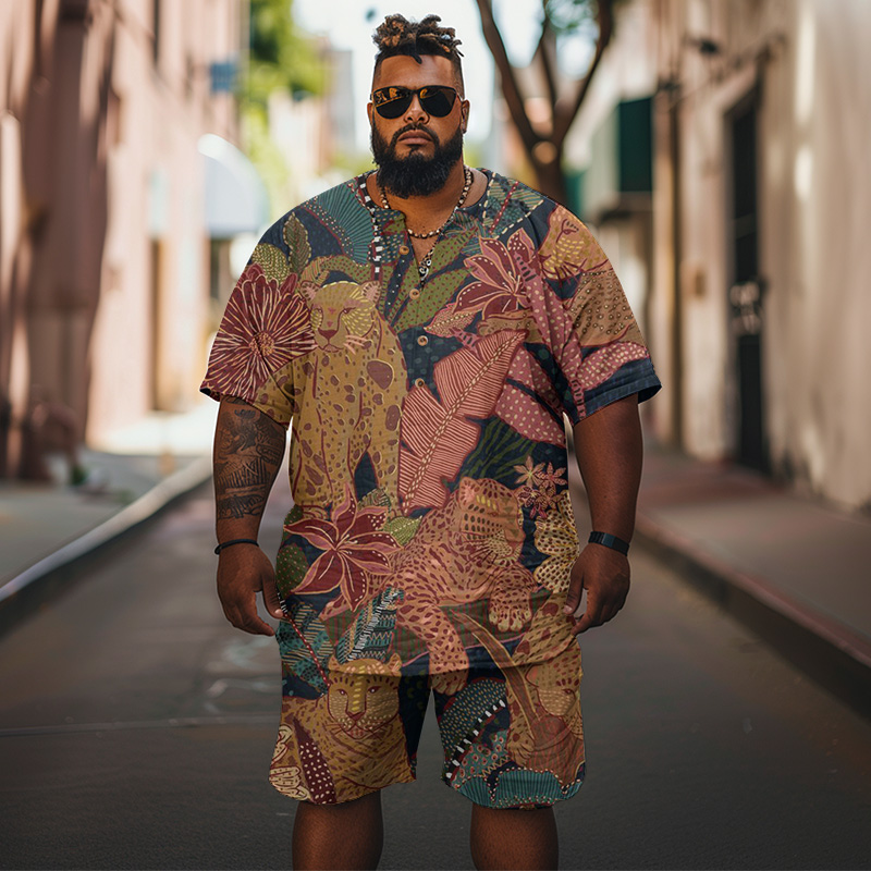 L-9XL Jungle Lion Vacation Style Plus Size Short Sleeved Shorts Two-piece Set