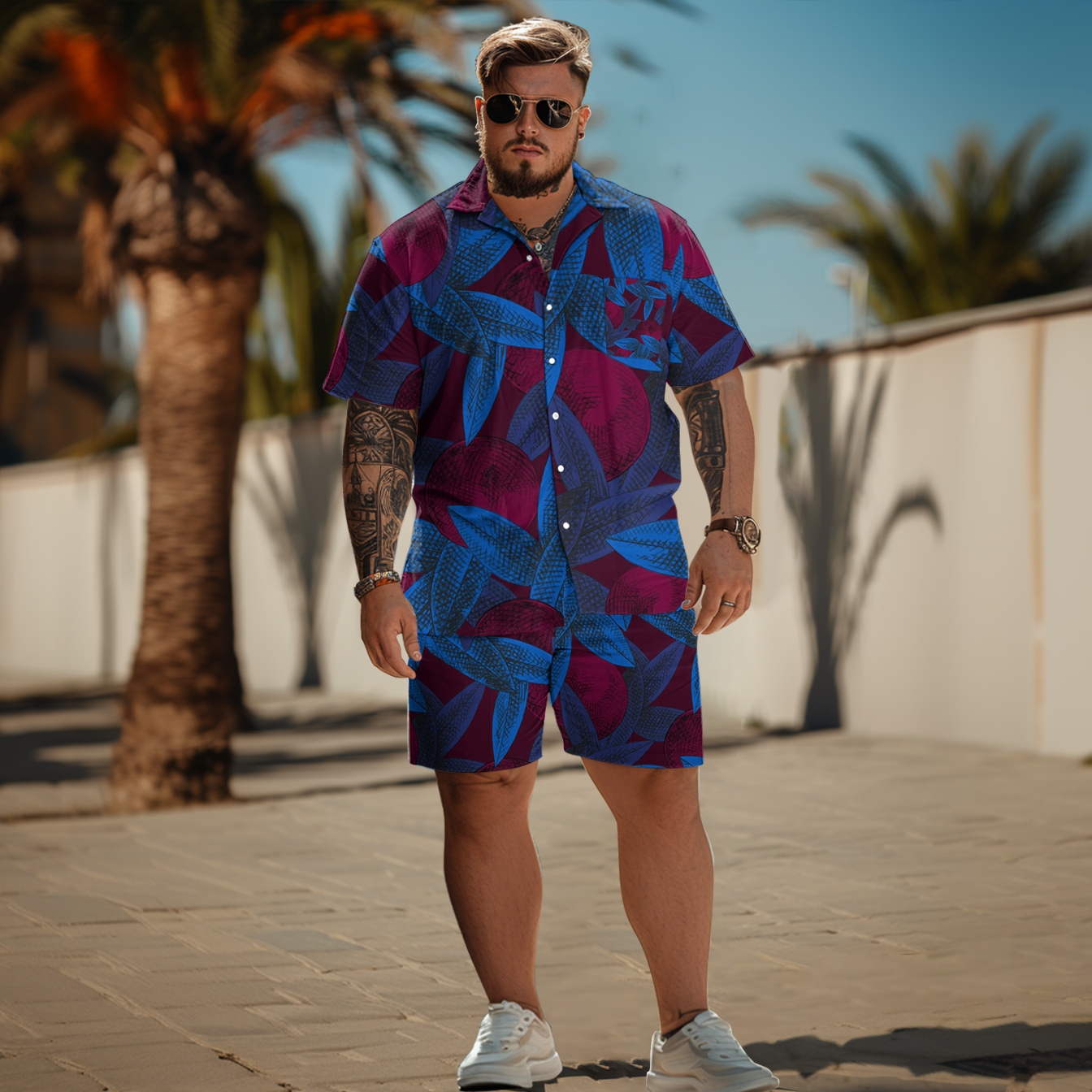 L-9XL Plant Print Vacation Style Plus Size Shirt Short Sleeve And Shorts Set