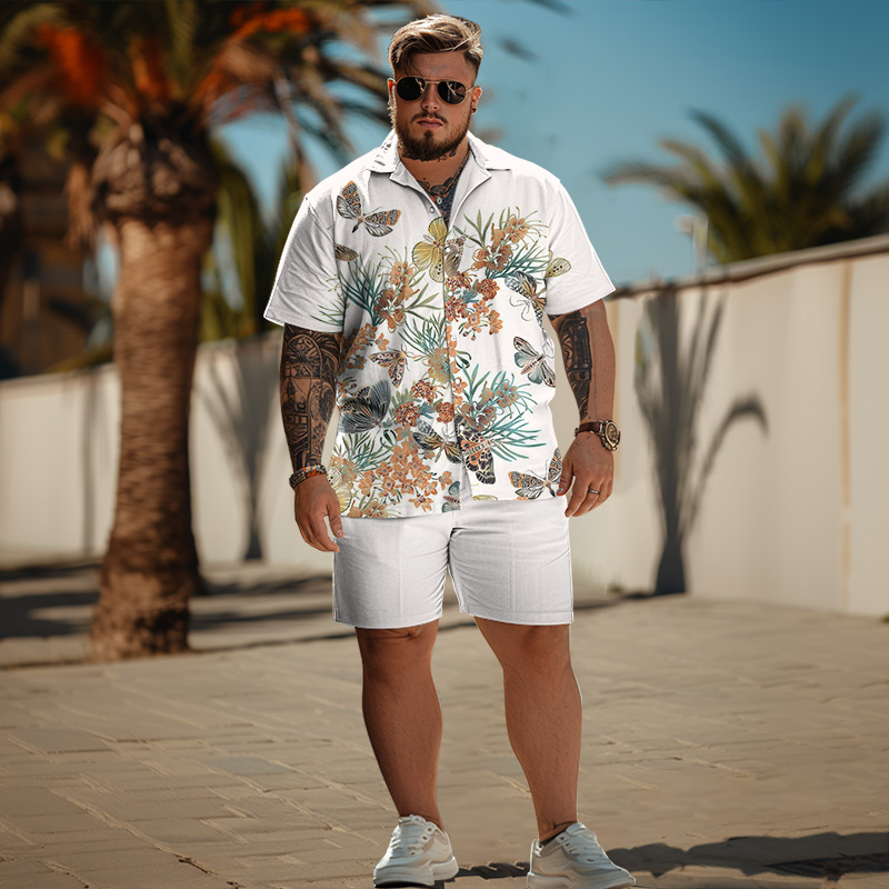 L-9XL Butterfly Floral Pattern Lapel, Vintage Vacation Style Short Sleeved Shorts Two-piece Set