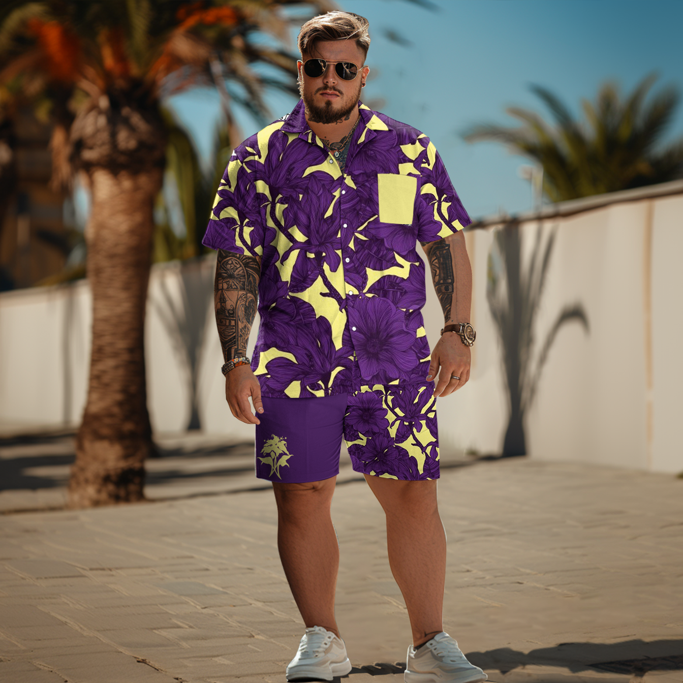 L-9XL Yellow Purple Plus Size Holiday Style Shirt Short Sleeve And Shorts Two-piece Set