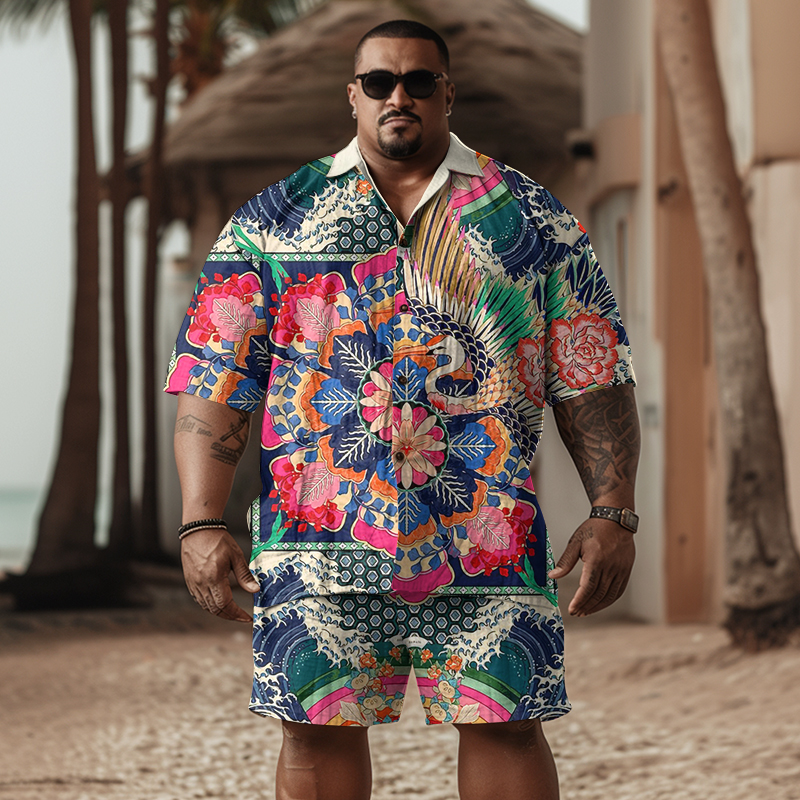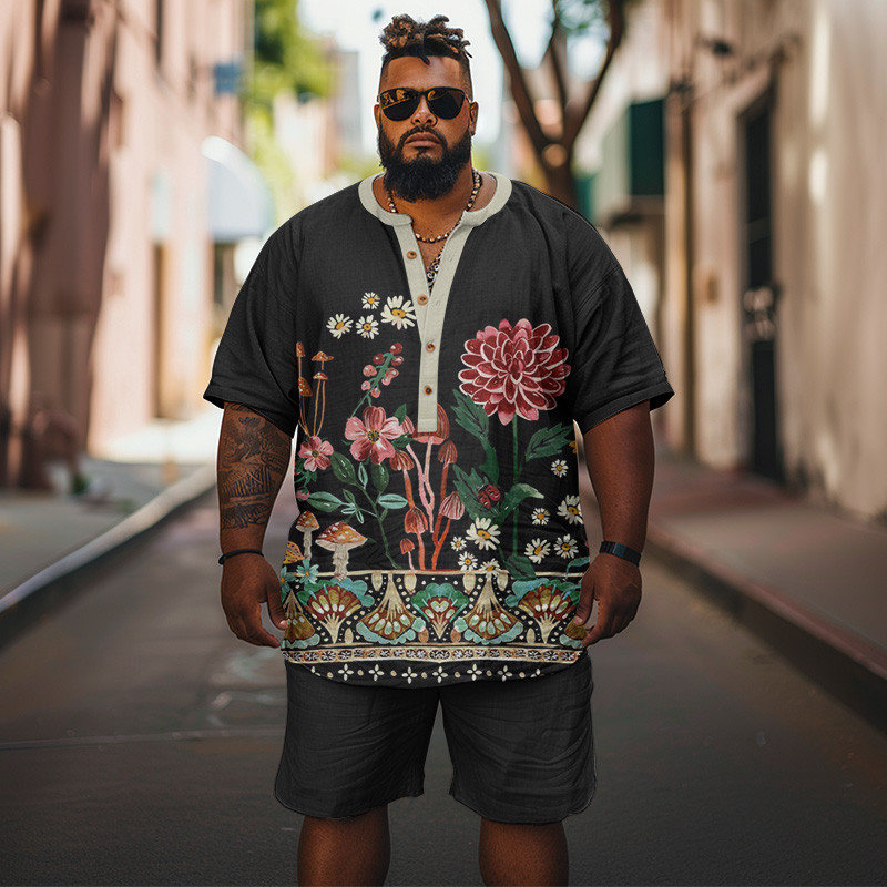 L-9XL Japanese Style Large Floral Pattern Henley Collar Vacation Style Short Sleeved Shorts Two-piece Set
