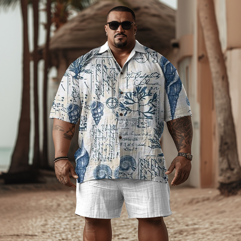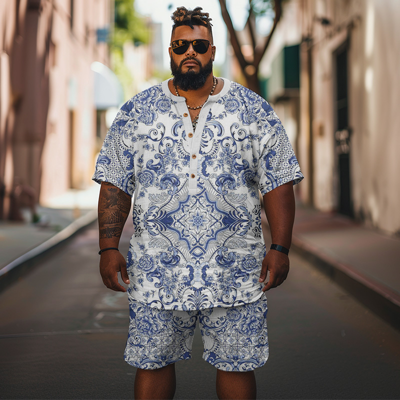 L-9XL Blue And White Porcelain Vacation Style Short Sleeved Shorts Two-piece Set