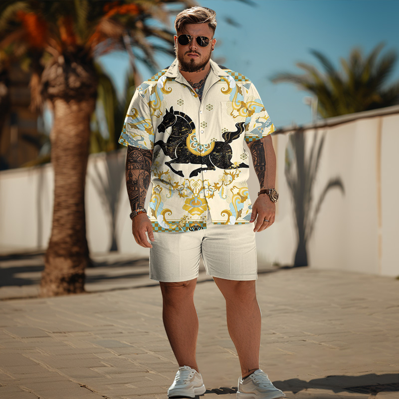 L-9XL Black Horse Pattern Lapel Vacation Style Short Sleeved Shorts Two-piece Set
