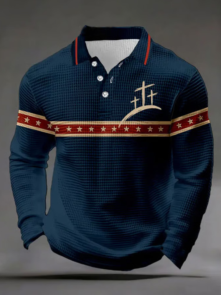 Pluslx Men's Retro Letter Design Waffle Fabric Long Sleeve Polo Shirt