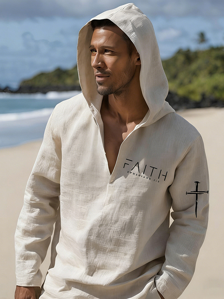 Pluslx Men's Vintage Faith Cross Art Print Linen Hooded Sweatshirt