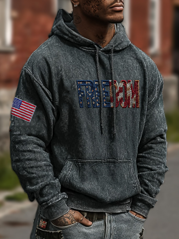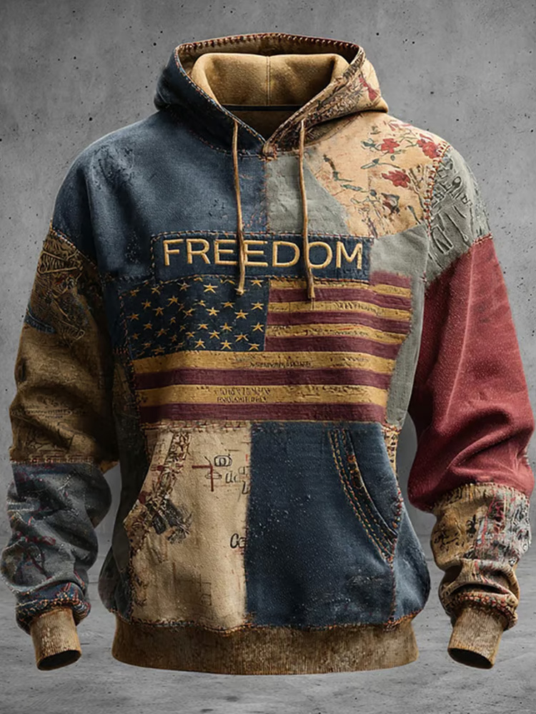 Men's Casual Retro Freedom Print Long-sleeved Hooded Sweatshirt