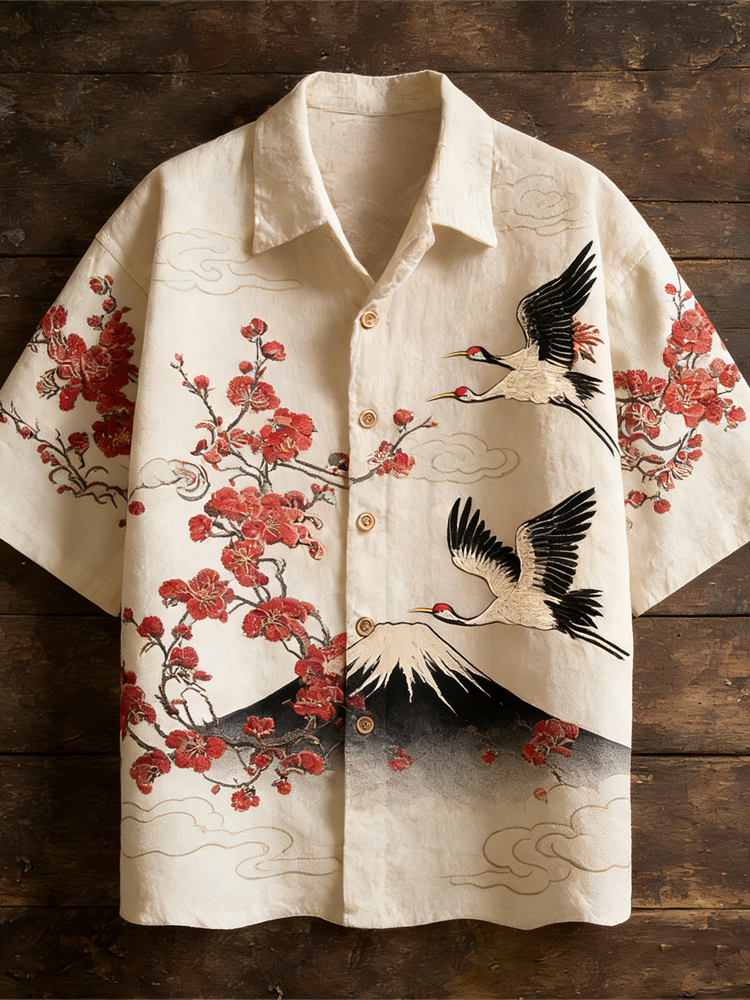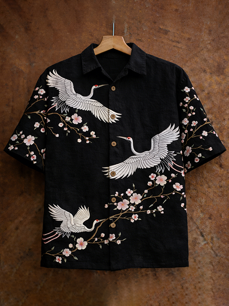 Pluslx Men's Japanese-style Cherry Blossoms And Cranes Art Linen Short-sleeved Shirt