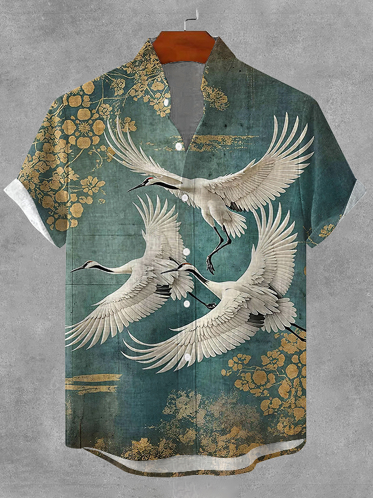 Pluslx Men's Vintage Crane Japanese Art Print Casual Shirt