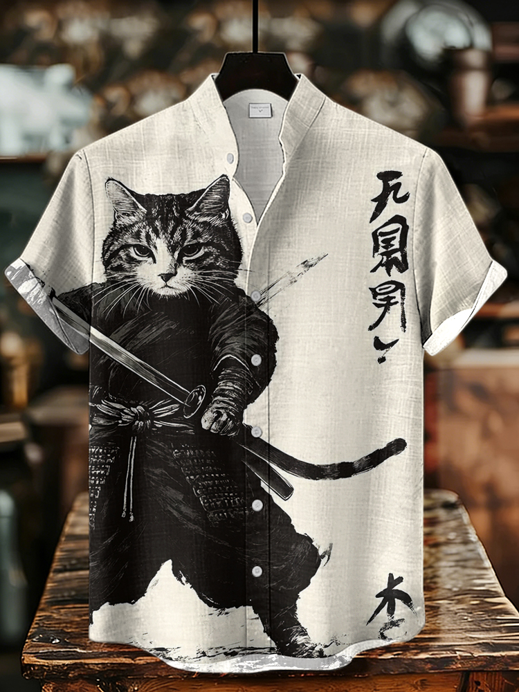 Pluslx Men's Japanese-style Fun Cat And Dragon Pattern Linen Short-sleeved Shirt
