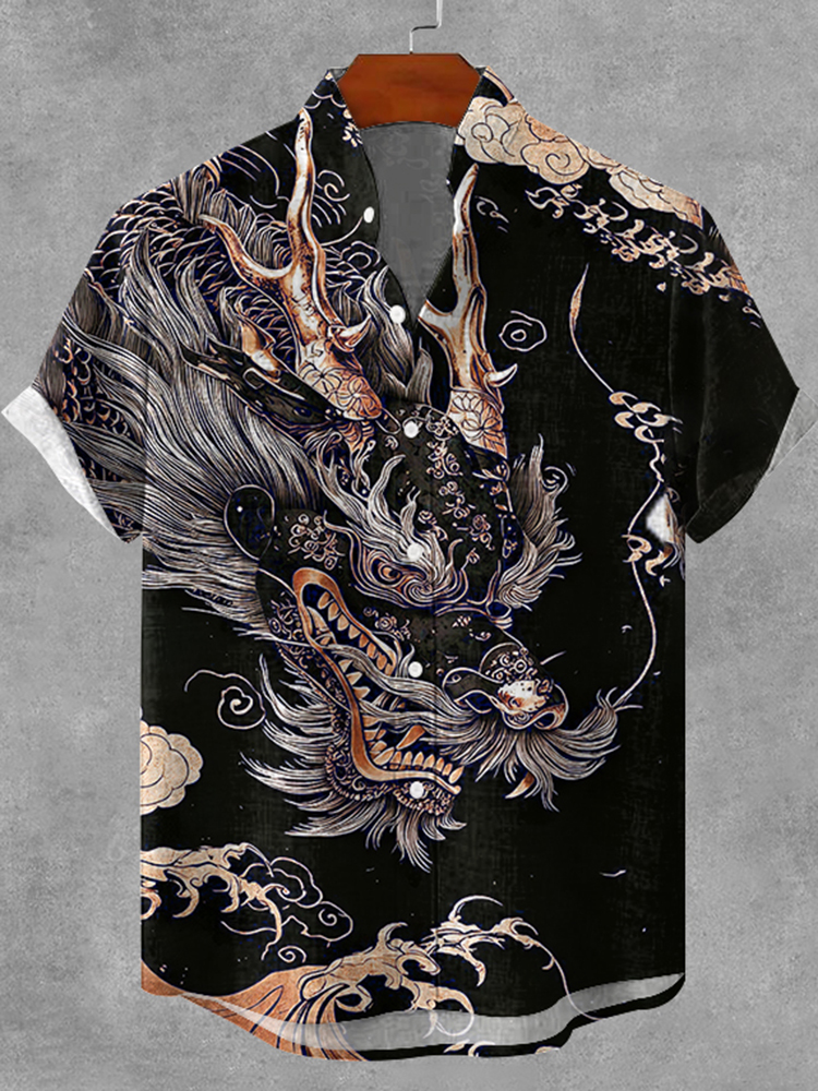 Pluslx Japanese Ocean & Dragon Totem Men's Linen Short Sleeve Shirt