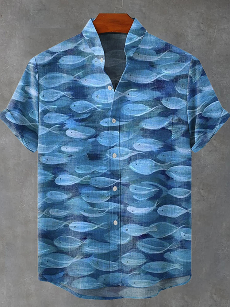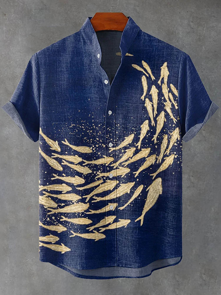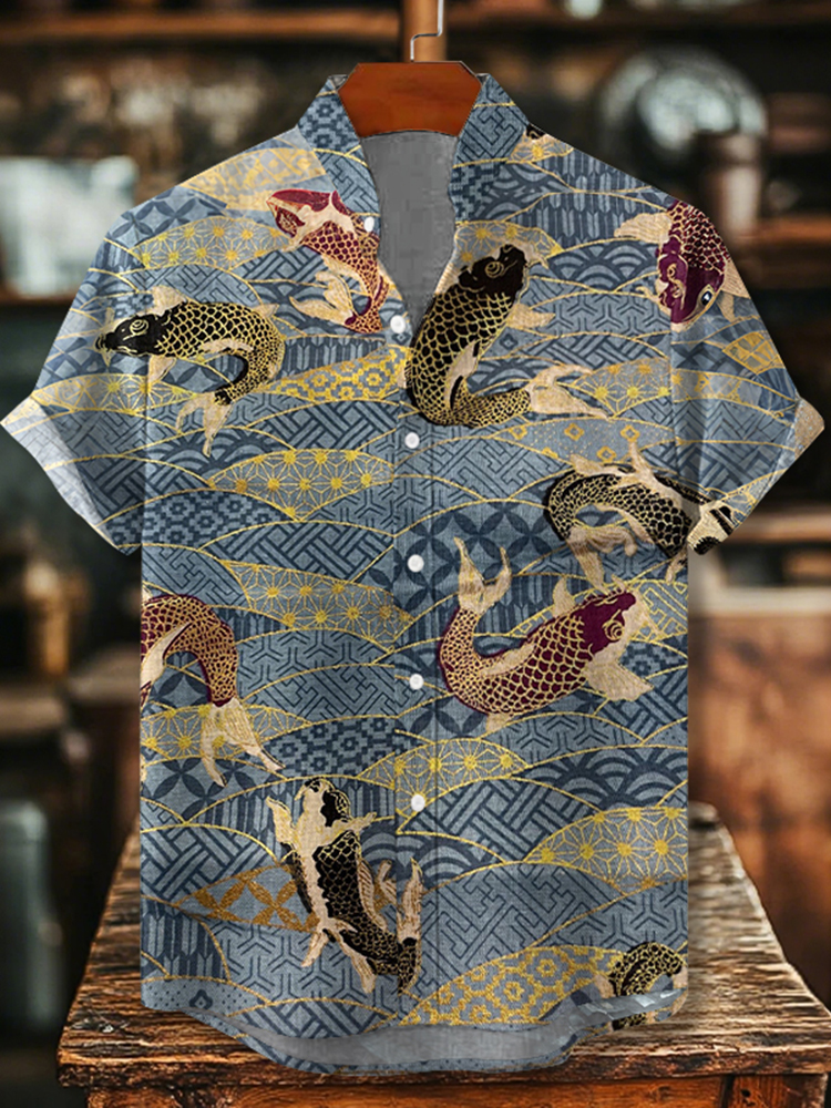 Pluslx Men's Japanese Koi And Ocean Pattern Linen Short-sleeve Shirt