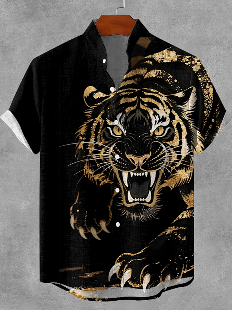 Pluslx Vintage Japanese Tiger Art Pattern Linen Shirt