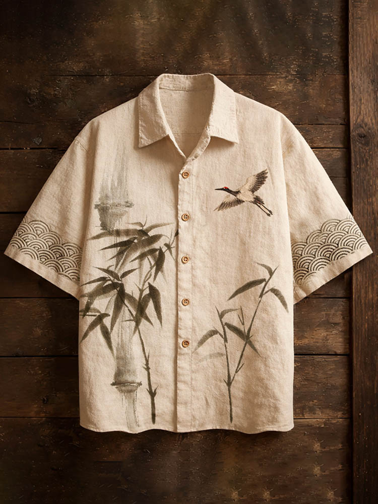 Pluslx Men's Japanese-style Bamboo Cranes Pattern Linen Short-sleeved Shirt