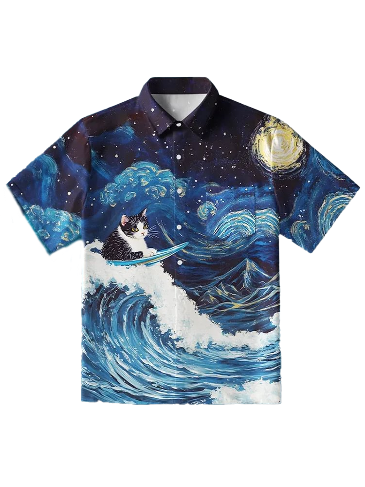 Pluslx Cat And Waves In The Night Sky Hawaiian Shirt