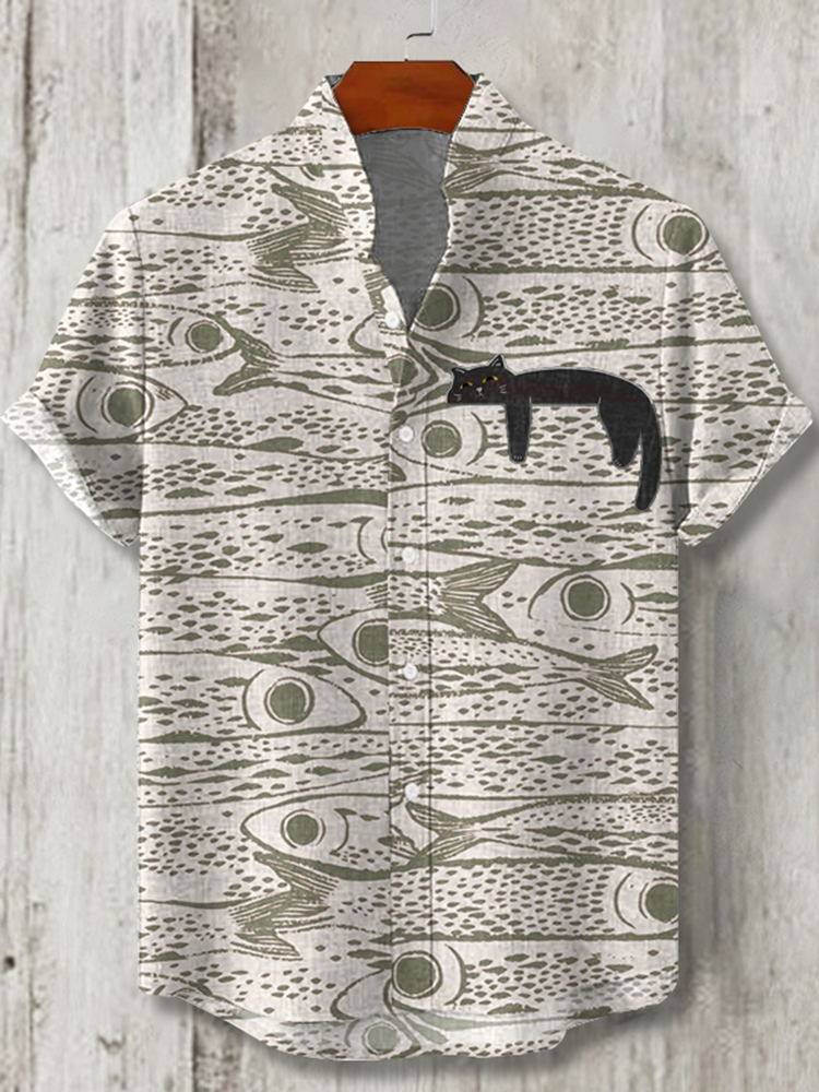 Pluslx Men's Schools Of Fish With Lazy Black Cat Japanese Art Print Button Casaul Shirt