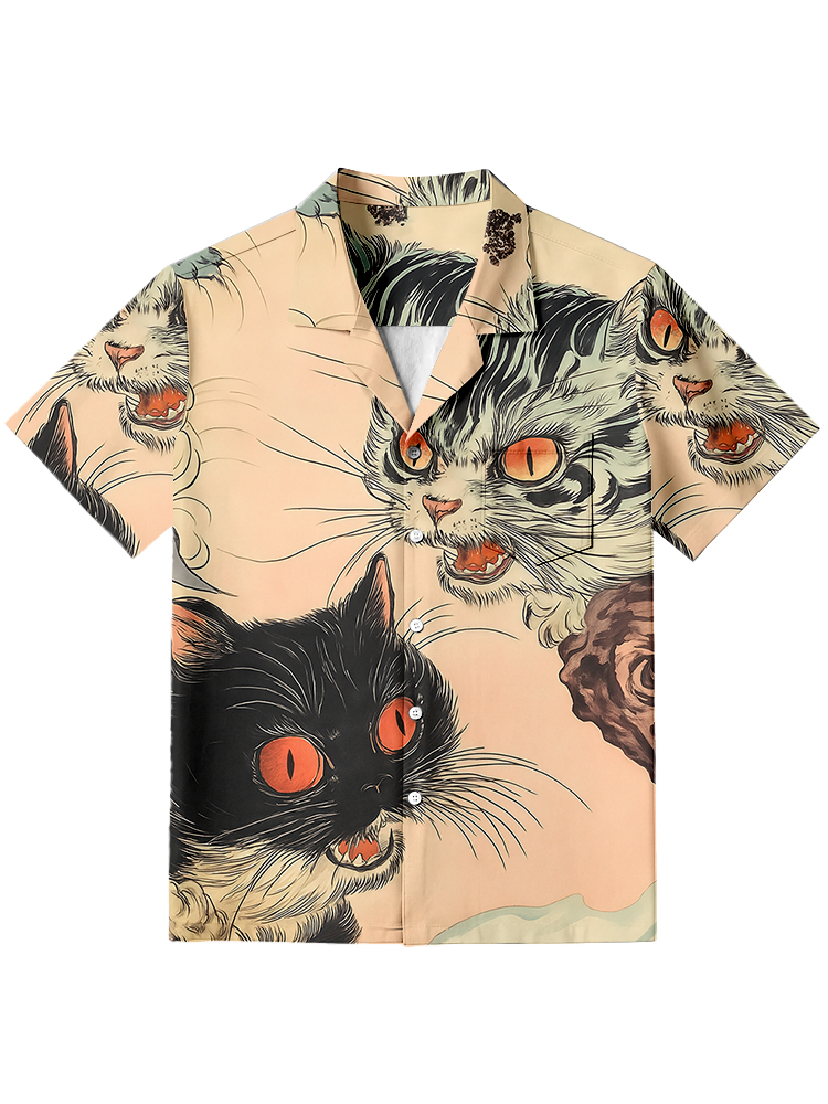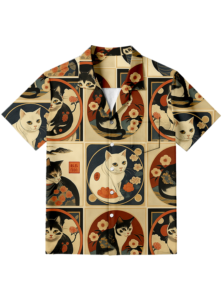 Pluslx Meiji Era Cat All-over Pattern Ukiyo-e Hawaiian Shirt