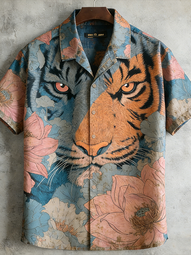 Pluslx Japanese Art Retro Plant Flower And Tiger Pattern Men's Short Sleeve Shirt