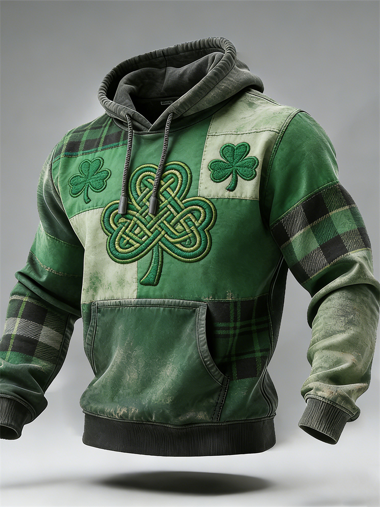 Pluslx Men's St. Patrick Celtic Shamrock Plaid Colorblock Hoodie