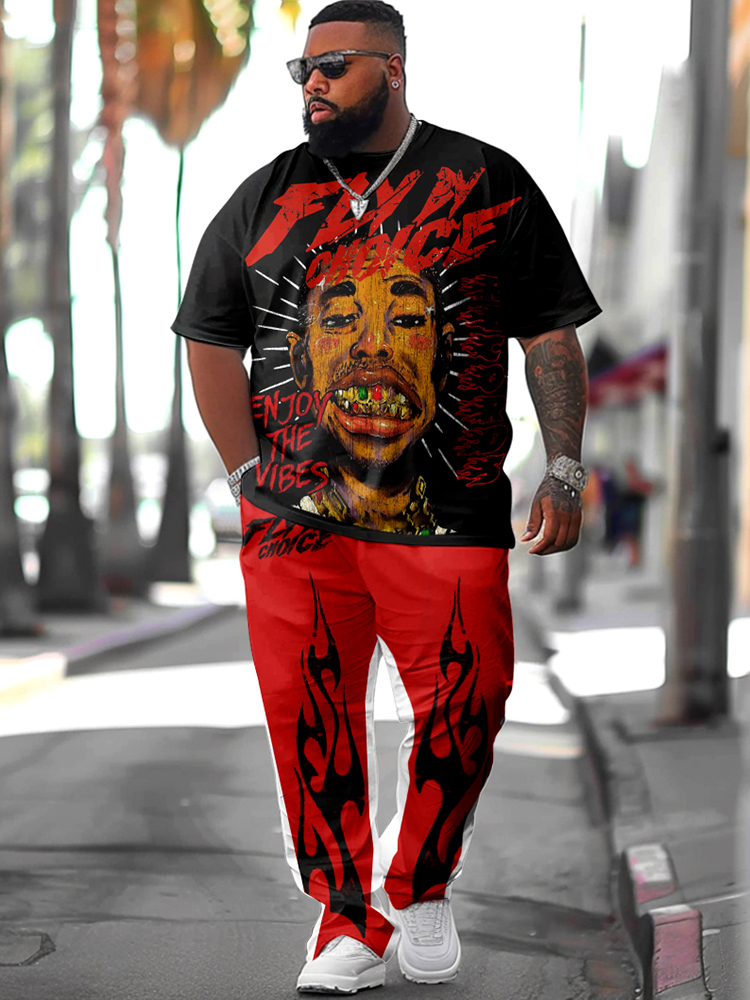 L-9XL Men's Plus Size Street Hip Hop Endless The Hustler Superstar In Red Graphic Casual Street Short-Sleeved Trousers Casual Two-Piece Set